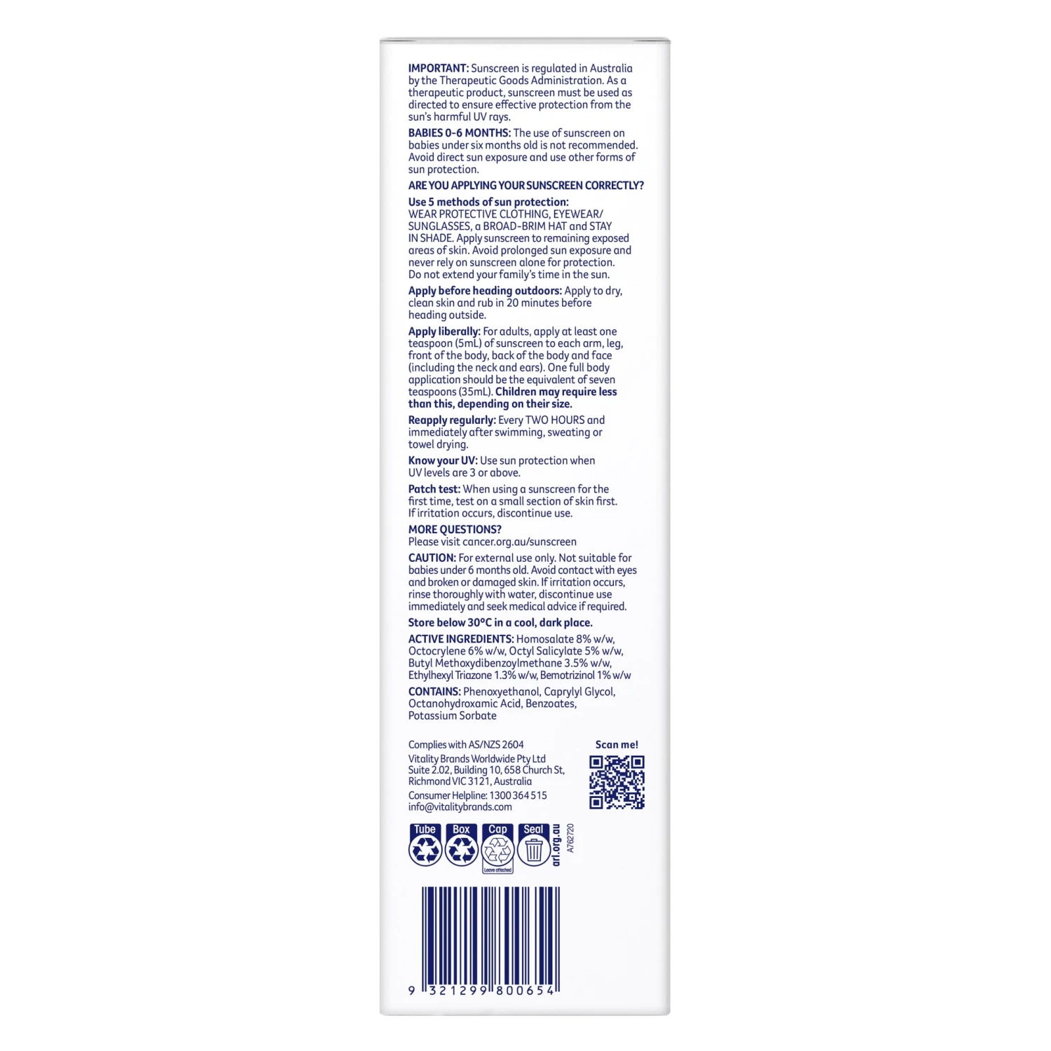 Active Ingredients: Homosalate 8% w/w, Octocrylene 6% w/w, Octyl Salicylate 5% w/w, Butyl Methoxydibenzoylmethane 3.5% w/w, Ethylhexyl Triazone 1.3% w/w, Bemotrizinol 1% w/w