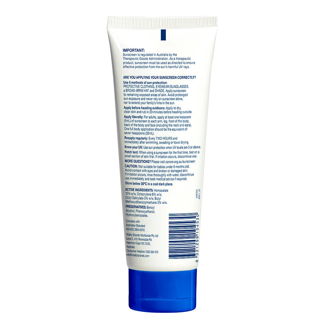 Active ingredients: Homosalate 10% w/w, Octocrylene 8% w/w, Octyl Salicylate 5% w/w, Butyl Methoxydibenzoylmethane 3% w/w